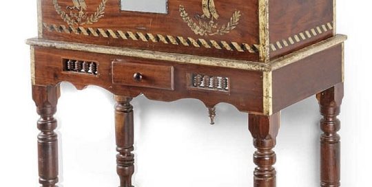 Williams2019-12-04T09:14:43+00:00Cofre colonial, probablemente Mexicano siglo XVIII En madera policromada con decoración geométrica, 45x87x47 cm. Mesa de época posterior, 74x94x52 cm